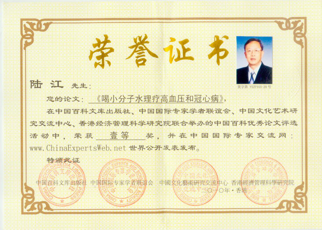 -----我是從事建筑的高工,本來沒有資格去攻克醫(yī)學(xué)難題,卻為了自身健康才扣響醫(yī)學(xué)的大門。由于我1990年患高血壓,因怕中風(fēng)才研究發(fā)明了離子水瓶,我把水處理成微小分子團(tuán)水,飲用后治愈了高血壓。便于1993年底送到三家省級醫(yī)院做臨床試用4個月。經(jīng)北京和廣西醫(yī)學(xué)專家鑒定:"降脂降壓效果好"," 能擴(kuò)大心腦動脈流量,改善心腦電圖以及微循環(huán)","對治療心腦動脈粥樣硬化、高血壓、高血脂有良好的醫(yī)療保健作用。""產(chǎn)品的技術(shù)性能和療效達(dá)到了同類產(chǎn)品的國內(nèi)領(lǐng)先水平,經(jīng)廣西醫(yī)學(xué)科學(xué)情報研究所檢索,未見國外有類似報道。"中國醫(yī)學(xué)科學(xué)院張正國教授從美國國立醫(yī)學(xué)圖書館數(shù)據(jù)庫存Medline檢索英俄文資料,均未見類似報告。2000年上市后,我為了對消費(fèi)者負(fù)責(zé)而繼續(xù)觀察研究,一直通過《信譽(yù)卡》和《質(zhì)量跟蹤調(diào)查書》向患者承諾療效,請用戶使用6個月后反饋效果。和脂壓患者飲用2至5個月內(nèi),消除癥狀,停服藥物,血壓正常;冠心病患者飲用3~5個月逐漸減輕至消除心絞痛、房顫等癥狀,不再服藥,飲用1年左右心電圖正常,經(jīng)冠脈造影掃描無明顯狹窄,表明冠心病痊愈。大量患者還反映許多衰弱器官被修復(fù),讓前列腺增生、慢性咽喉炎、慢性氣管炎、支氣管炎、慢性胃炎、腸炎和膽囊炎等不藥而愈;2型糖尿病患者是因?yàn)橐葝u衰弱致病,飲用該水半年至一年,逐漸減藥至停藥,血糖尿糖正常,真正治愈2型糖尿病。中風(fēng)后遺癥患者飲用六七個月,可逐漸減輕至消除肢體和語言障礙,表明飲用該水能讓壽命很長的神經(jīng)元細(xì)胞逐漸修復(fù),奇跡般地恢復(fù)肢體和語言功能。飲用后還使胸腺和脾臟兩個重要的免疫器官被修復(fù)和增強(qiáng),產(chǎn)生免疫細(xì)胞多,提高了免疫力,使人不生病或少生病。自此, 飲用微小分子團(tuán)水創(chuàng)造了攻克冠心病、高(低)血壓和糖尿病三大醫(yī)學(xué)難題的奇跡。人們對此感到不可思議,但實(shí)踐是檢驗(yàn)真理的唯一標(biāo)準(zhǔn)。